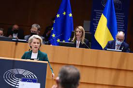 Ursula Von der Leyen, présidente de la Commission européenne, a pris une initiative tout aussi irresponsable, le dimanche 27 février, déclarant à propos des Ukrainiens : « Ils sont des nôtres » inscrivant ainsi l’avenir de l’Ukraine dans une démarche d’adhésion à l’Union européenne. Volodymyr Zelensky, jouant, lui, son jeu, a exprimé un désir d’adhérer à l’Union européenne selon une procédure accélérée. Si ce vœu reste de l’ordre du slogan, les procédures étant extrêmement complexes, il vient, dans une coordination parfaite entre Zelensky, Von der Leyen et Borell, saper la doctrine de l’ « étranger proche » qui restait une ligne infranchissable y compris pour les puissances de l’OTAN. A noter : la scénographie, ce mardi 1er mars, de l’ intervention effectuée par la présidente du Parlement européen mettait en regard deux drapeau (UE, Ukraine) dont les couleurs, presque identiques, créaient un effet de miroir assez saisissant.