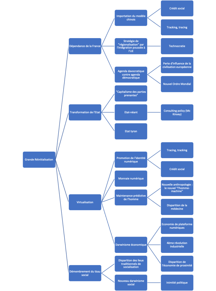 La Grande réinitialisation est en effet un danger pour l’indépendance de la France que vous défendez corps et âme. Par le Pass sanitaire, vaccinal, par l’ambition de créer un Crisis Data Hub, plateforme numérique centralisant les données sanitaires et personnelles un temps envisagé par le Sénat (rapport de juin 2021 !), par le tracking et le tracing, nous sommes en train de télécharger le modèle chinois. Les Français sont progressivement conscients que nous importons littéralement une culture, des pratiques sociales (le fameux « crédit social ») qui ne sont pas les nôtres. Ils le sentent mais cette disparition du modèle français ne leur est pas expliquée avec clarté et honnêteté. Le modèle chinois qui paraît fasciner un grand nombre de nos élites est une synthèse savante entre un capitalisme de Titans et de Géants (François Lévêque, Les entreprises hyperpuissantes) et un communisme postmoderne fondé sur la mise en commun des données numériques et une traçabilité des hommes, des biens et des capitaux qui se substitue à l’intenable « libre circulation » de ces mêmes hommes, biens et capitaux. Notre modèle social, déjà bien malade, ne survivrait pas à l’import d’un habitus culturel et civilisationnel si étranger aux mœurs européennes et françaises. La Grande Réinitialisation, véhiculée de manière inconséquente par nos politiques, est le cheval de Troie de ce modèle qui met en danger évident l’indépendance et l’identité de la France.